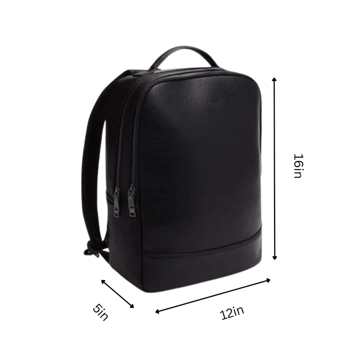 A laptop-sized black vegan leather backpack with a smooth front exterior and a rectangular shape with rounded corners. It has two compartments, a top handle, and straps on the back.