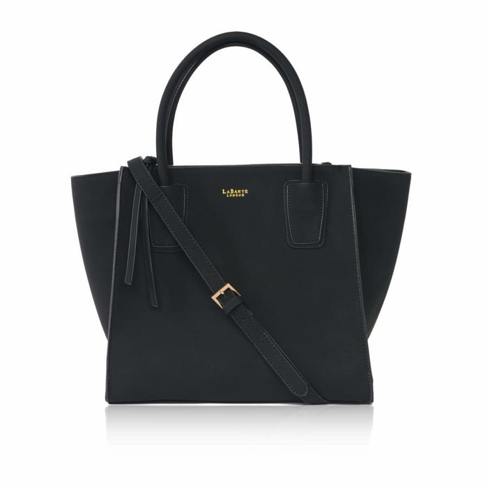 The stunning Black Demi bag from LaBante London is a Designer winged tote bag featuring gold hardware plaques on the base bearing the LaBante logo for an elegant look. It comes with two zipper compartments and a central zipper compartment for super organisation of all your items. Featuring inner side zip pockets as well as two open pockets for keys and phones. This black tote handbag made sustainably is a simple but perfectly sized bag for your day or evening out. Comes with a long detachable & adjustable shoulder strap. Fits a 13-inch Laptop. Made with Love, Wear with Pride.