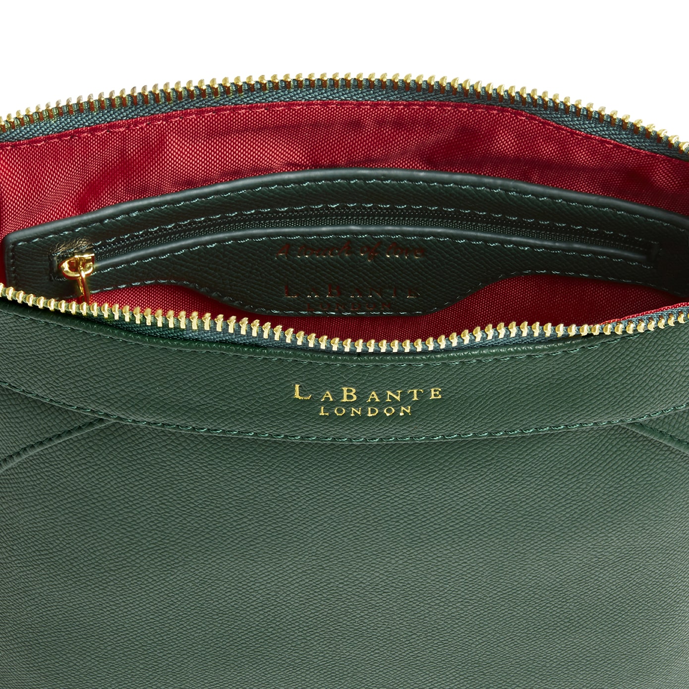 The Raven Forest Green Vegan Small Crossbody Bag is your perfect travel accessory- Part of the LaBante Kindness collection which is dedicated to creating the highest quality cruelty free accessories. This little crossbody is perfect for your everyday essentials. Featuring a purple recycled plastic bottle lining with beautiful gold hardware. It includes a detachable adjustable shoulder strap. It is a multi-functional bag that includes inside zipper pocket and keys and phone compartments.