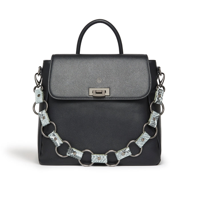 The Zuri backpack from LaBante London is the ultimate in simplicity. Featuring the signature LB round logo and custom made gun hardware, even the most contemporary woman will find this bag irresistible. Light in weight with a Zip Closure this backpack features interiors made from recycled plastic bottles. The ultimate in sustainable slow fashion, this backpack converts into a shoulder bag with the designer faux snake stud strap provided or into a across body bag with the adjustable multiway straps provided. It is the perfect post pandemic accessory! The iconic LB logo signals cruelty free and sustainable.