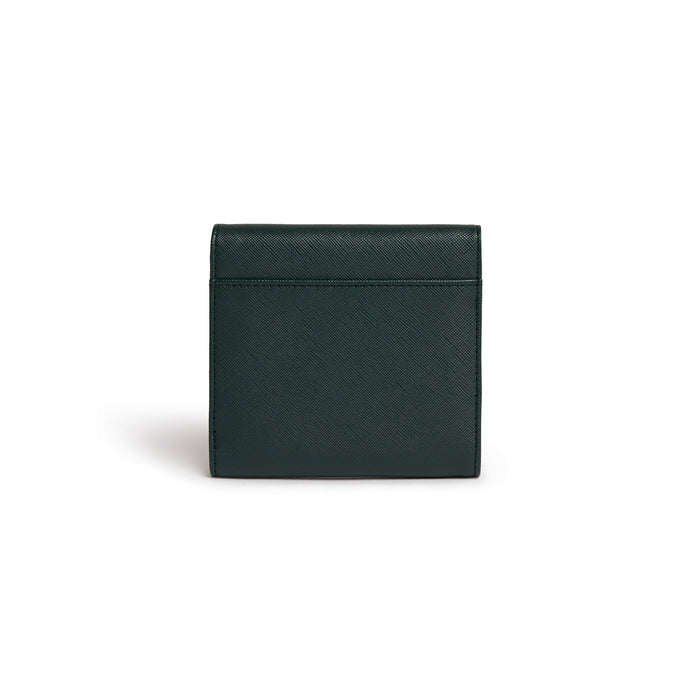 This classic wallet sculpts a slim and sophisticated silhouette on a forest green faux leather. The squared body is designed on faux saffiano texture and features gold metal details and an embossed logo.