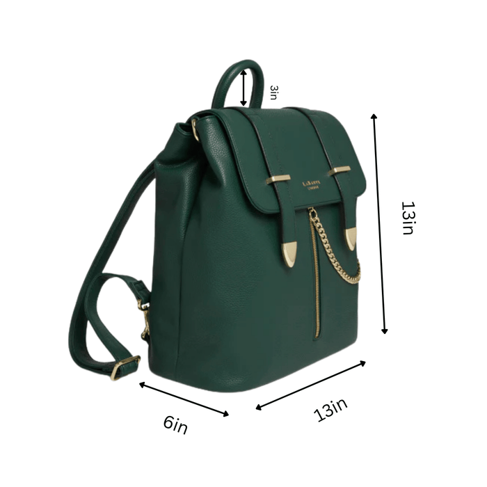 The versatile Agnes Ladies backpack from LaBante London, is the perfect Vegan Faux Leather Designer Backpack for your everyday needs, whether for work or travelling, you will find the double inner compartments spacious. For comfort the backpack comes with two fastening belts so it’s easy to adjust to fit. An attached chain from the center zip puller adds a touch of style and femininity to this gorgeous womans rucksack. This backpack also fits a 13 inch macbook laptop.