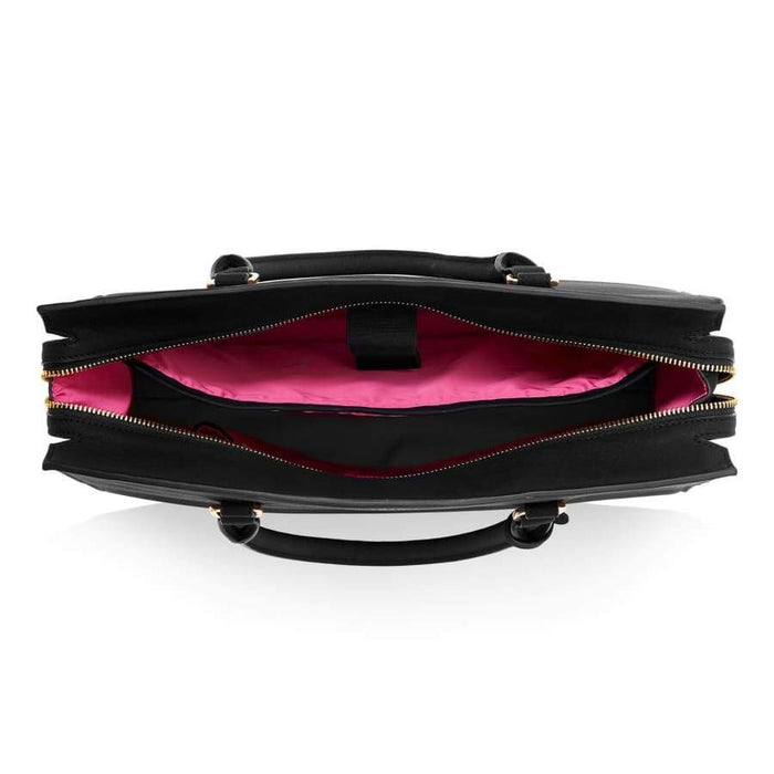 This Aricia Laptop tote bag from LaBante London is part of our exclusive Sheridyn collection inspired by the wonders of nature. It is a classic piece and perfect for the everyday woman on the go. Featuring a fuchsia lining with beautiful gold hardware it includes a 13-inch laptop compartment and a detachable adjustable shoulder strap. It is a stylish womens handbag with a laptop compartment that includes a zip pocket at the back, inside zipper pocket and keys and phone compartments, making this the perfect laptop work bag for women on the go.