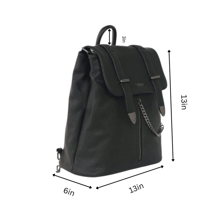 The versatile Agnes Ladies backpack from LaBante London, is the perfect Vegan Faux Leather Designer Backpack for your everyday needs, whether for work or travelling, you will find the double inner compartments spacious. For comfort the backpack comes with two fastening belts so it’s easy to adjust to fit. An attached chain from the center zip puller adds a touch of style and femininity to this gorgeous womans rucksack. This backpack also fits a 13 inch macbook laptop.