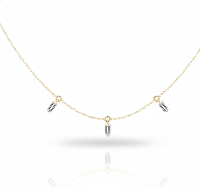 Three baguette-cut stones shimmer delicately along a fine 14ct gold chain, each one representing past, present, and future. Handcrafted by master jewellers, every facet is cut to reflect subtle radiance with effortless grace.